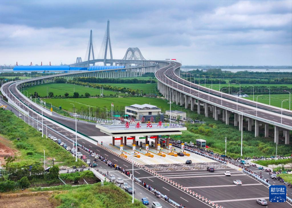 9月9日,车辆在常泰长江大桥北岸收费站有序通过(无人机照片)。新华社发(顾继红 摄)